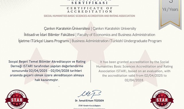 Çankırı Karatekin Üniversitesi İktisadi ve İdari Bilimler Fakültesi bünyesinde faaliyet gösteren İşletme Bölümü, eğitim kalitesini bir kez daha tescilledi. Sosyal Beşeri Temel Bilimler Akreditasyon ve Rating Derneği (STAR) tarafından yapılan değerlendirme sonucunda bölüm, üç yıl süreyle geçerli akreditasyon belgesi almaya hak kazandı.