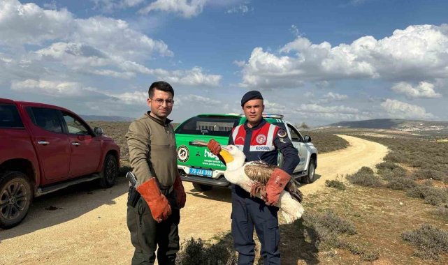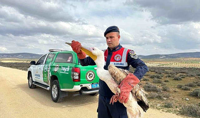 Kilis'te jandarma ekiplerince yaralı ve bitkin halde bulunan pelikan, Doğa Koruma ve Milli Parklar ekiplerine teslim edildi.