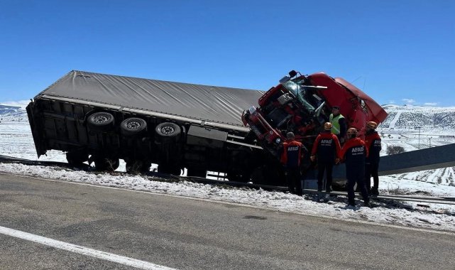 Sivas'ta kontrolden çıkan tır, Elektronik Denetleme Direğine çarpıp bariyerlerde asılı kaldı. Tırda sıkışan sürücü AFAD ekipleri tarafından kurtarıldı.