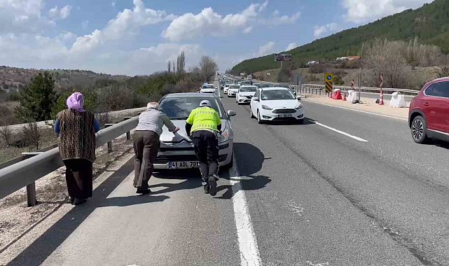 Ramazan Bayramı tatilinin dönüş yolunda aracı bozularak yolun ortasında kalan yaşlı çifte, trafik polisi aracı iterek ve çekici çağırarak yardım etti.