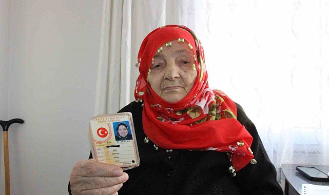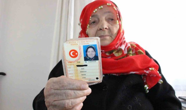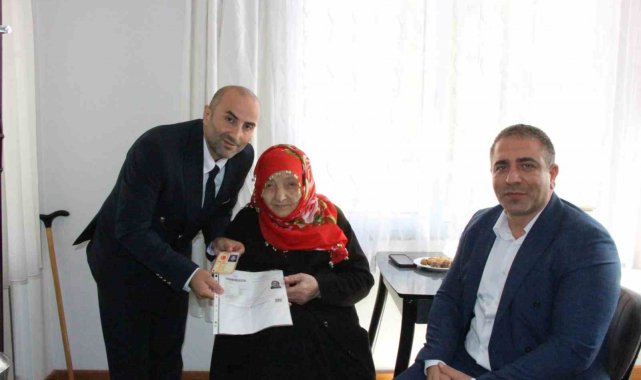 Meryem nine, Kaymakam Selçuk Baş ve İlçe Nüfus Müdürü Ümit Kalaycı tarafından evinde ziyaret edilerek yeni kimlik kartına kavuştu.