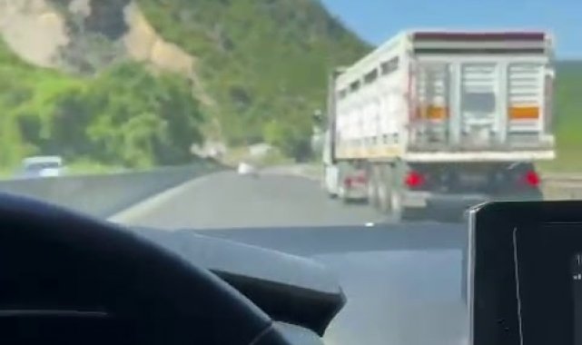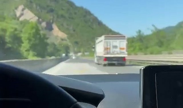 Sakarya'nın Geyve ilçesi D-650 kara yolunda bir otomobil sürücüsü 120 kilometre hızla gitmesine rağmen önündeki tıra yetişemedi. Hız limitini aşan tırın tehlikeli yolculuğu, "Sonra niye bu yolda kaza oluyor" sözleri ile kaydetti.