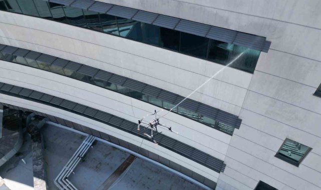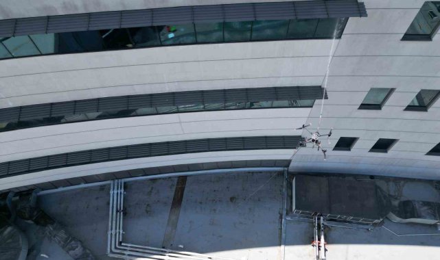 Denizli Pamukkale Üniversitesi (PAÜ) Hastanesinin yıllardır temizlenmeyen 14 katlı hizmet binasının camları dron ile yıkandı.