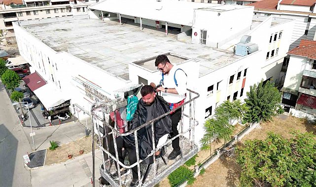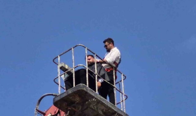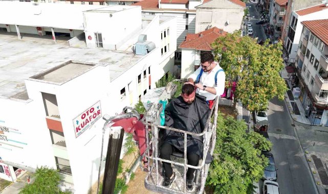 Düzce'de 15 yıldır berberlik yapan Barış Kahya, kendi iş yerini açmanın mutluluğunu ilginç bir etkinlikle kutladı. Kahya, iş yerinin önüne getirilen vincin sepetine tıraş sandalyesi ve ekipmanlarını yerleştirdikten sonra, müşterisi Taner Çelik ile birlikte 20 metre yüksekliğe çıktı. Güvenlik önlemlerinin alındığı etkinlikte Kahya, esen rüzgara ve yüksekliğe rağmen müşterisi Çelik'i yaklaşık 20 dakika süren bir çalışmayla tıraş etti. Kahya, bu sırada makas çevirerek küçük bir gösteri de sundu. Yerden metrelerce yüksekte yapılan tıraş, çevredeki vatandaşların da ilgisini çekti. Bazı vatandaşlar bu anları cep telefonlarıyla kaydetti.