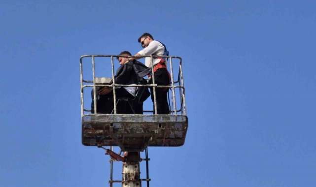 Düzce'de berber Barış Kahya, yeni açtığı dükkanının ilk tıraşını vinç sepetiyle yerden 20 metre yükseklikte yaptı.