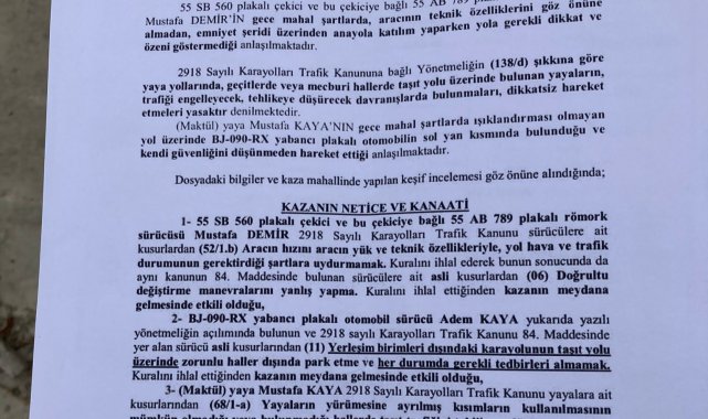 Hazırlanan bilirkişi raporunda ise hem tır şoförünün hem otomobil sürücüsünün hem de hayatını kaybeden Mustafa Kaya'nın kusurlu olduğuna yer verildi. Rapora göre, tır şoförü Mustafa Demir hız ve manevra kurallarını ihlal ederek asli kusurlu sayıldı. Otomobil sürücüsü Adem Kaya'nın, karayolunda usulsüz park ederek kazada etkili olduğu, maktul Mustafa Kaya'nın ise yol üzerinde yürüyerek trafik güvenliğini tehlikeye soktuğu kaydedildi.