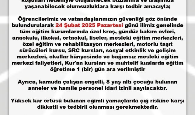 Rize Valiliği tarafından yapılan açıklamada, 23 Şubat Pazartesi günü il genelinde eğitim-öğretime 1 gün ara verildiği ifade edildi. Açıklamada, "İlimiz genelinde devam eden yoğun kar yağışı ve soğuk hava koşulları nedeniyle oluşabilecek buzlanma ve ulaşımda yaşanabilecek olumsuzluklara karsı tedbir amacıyla öğrencilerimiz ve vatandaşlarımızın güvenliği göz önünde bulundurularak 24 Şubat 2025 Pazartesi günü ilimiz genelinde tüm eğitim kurumlarında eğitim-öğretime 1 gün ara verilmiştir. Ayrıca kamuda çalışan engelli, 8 yaş altı çocuğu bulunan anneler ve hamile personel idari izinli sayılacaktır. Yüksek kar örtüsü bulunan eğimli yamaçlarda çığ riskine karşı dikkatli ve tedbirli olunması gerekmektedir" denildi.