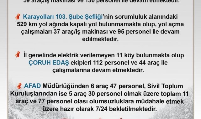 Rize'de Karayolları 103. Şube Şefliği'nin sorumluluk alanında bulunan 529 kilometrelik yol ağının açık olduğu belirtilirken, 37 iş makinesi ve araç ile 95 kişiden oluşan ekipler oluşabilecek olumsuzlukların önüne geçebilmek için hazırda bekliyor. Acil Durum ve Afet Yönetimi (AFAD) Rize İl Müdürlüğüne bağlı ekipler de olumsuzluk yaşanmaması adına bölgede hazır bekliyor. 6 araç ve 47 personel teyakkuzda beklerken, diğer sivil toplum kuruluşlarından da 5 araç ve 30 personel teyakkuzda bekliyor.
