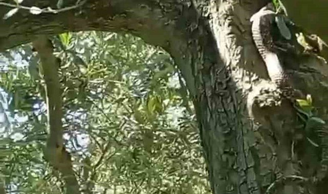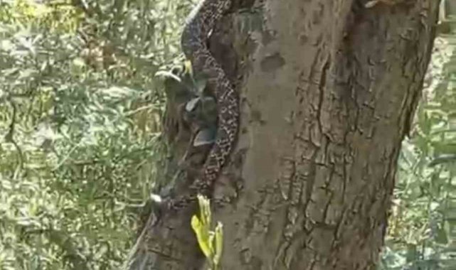 Bursa'nın İznik ilçesinde zeytin ağacının üstünde görülen 2,5 metre uzunluğundaki yılan cep telefonu kamerasına yansıdı.