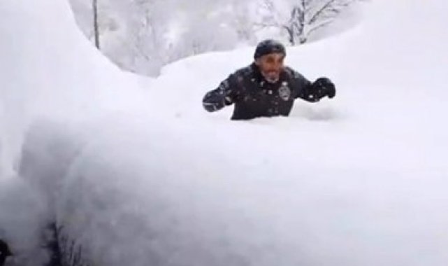 Kastamonu'nun Çatalzeytin ilçesinde bir vatandaş, 2 metre kalınlıktaki karda yürüyemeyince yüzerek evine gitmeye çalıştı. Eşi tarafından çekilen o görüntüler, sosyal medyada büyük beğeni aldı.