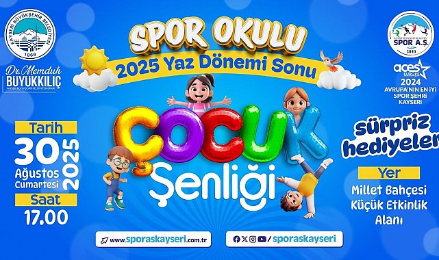 Başkan Dr. Memduh Büyükkılıç'ın standart yerel yönetim hizmetlerinin yanı sıra sağlık ve sporu da önceleyen hizmet vizyonu doğrultusunda Kayserilileri etkin ve kaliteli spor hizmetleri ile buluşturan Spor A.Ş., yediden yetmişe her yaştan vatandaşa sporu sevdirmeye devam ediyor. Bu çerçevede Büyükşehir Belediyesi Spor A.Ş. Altın Bayrak Ödüllü Avrupa Spor Şehri Kayseri'de 19 spor tesisinde onlarca farklı branşta zengin içerikli eğitimler verdiği Spor Okulları Yaz Dönemi'ni başarılı bir şekilde tamamladı. Cimnastikten buz patenine, futboldan masa tenisine, atletizmden yüzme, basketbol, hentbol, voleybol, taekwondo ve kick boksa kadar birçok branşta tam donanımlı tesisleri ve uzman kadrosu ile dolu dolu bir yaz döneminde hemen her yaş grubuna hizmet veren Spor A.Ş., başarılı bir dönemin ardından muhteşem bir Spor Okulları Yaz Dönemi Kapanış Programı'na hazırlanıyor. Büyükşehir Belediyesi Spor A.Ş. tarafından Millet Bahçesi Küçük Etkinlik Alanı'nda 30 Ağustos Cumartesi günü saat 17.00'de 2025 Spor Okulları Yaz Dönemi Sonu Çocuk Şenliği düzenlenecek. Spor ve eğlence dolu programda spor gösterileri, çekilişler, maskot gösterileri, palyaço şovları, sosis balon etkinliği, sihirbaz gösterisi, ateş gösterisi, yüz boyama etkinliği, bubble Show ile çocuklara pamuk şeker ve dondurma ikramı yapılacak.