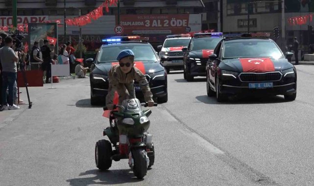 30 Ağustos Zafer Bayramı'nın 103'üncü yılı Bursa Valiliği'nin önünde coşkuyla kutlandı. Resmi geçit törenine akülü motoruyla katılan çocuk, geçiş sırasında dikkatleri üzerine çekti.
