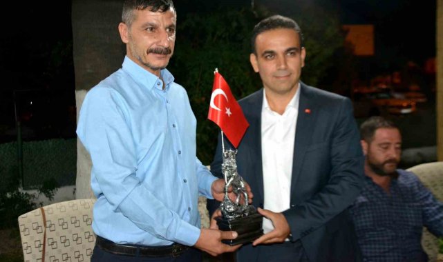 Yemekli toplantı ve açıklamanın ardından Tekin Yavuz, MHP Söke İlçe Başkanı Ömer Akalın'a Türk Bayraklı Bozkurt Heykeli hediye etti.