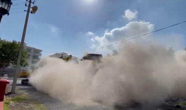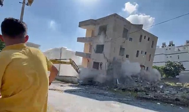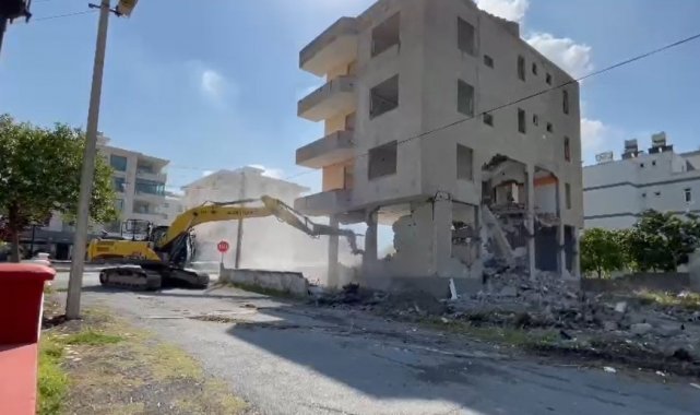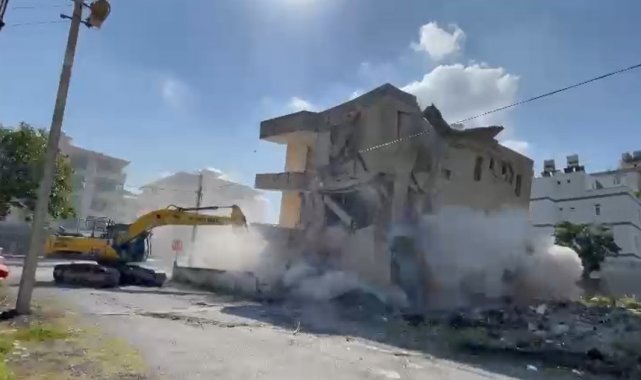 Hatay'ın Dörtyol ilçesinde 4 katlı binanın iş makinesinin darbesiyle yerle bir olduğu anlar kameraya yansıdı.