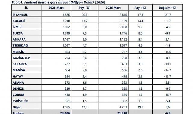 Bakanlık tarafından yapılan açıklamaya göre Mart ayında, İstanbul, Kocaeli, İzmir, Bursa ve Ankara ihracatta ilk beşte yer alan iller olurken, Tekirdağ, Mersin, Gaziantep, Sakarya ve Manisa ikinci beşte yer alan iller oldu. Faaliyet illeri bazında Mart 2026 ihracat sıralamasında 3 milyar 816 milyon dolarla İstanbul ilk sırada yer aldı. Kocaeli 3 milyar 159 milyon dolar ile ikinci, İzmir 2 milyar 8 milyon dolar ile üçüncü, Bursa 1 milyar 746 milyon dolar ile dördüncü, Ankara ise 1 milyar 192 milyon dolar ile beşinci oldu.