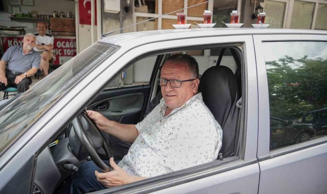 Bursa'da esnaflık yapan Ali İhsan Olcay, çaylarını 50 metre mesafedeki çay ocağından otomobiliyle taşıyor. Olcay, hem pratik olduğu hem de espri amaçlı tercih ettiği bu yöntemle şimdiye kadar hiç çay dökmediğini söylüyor.