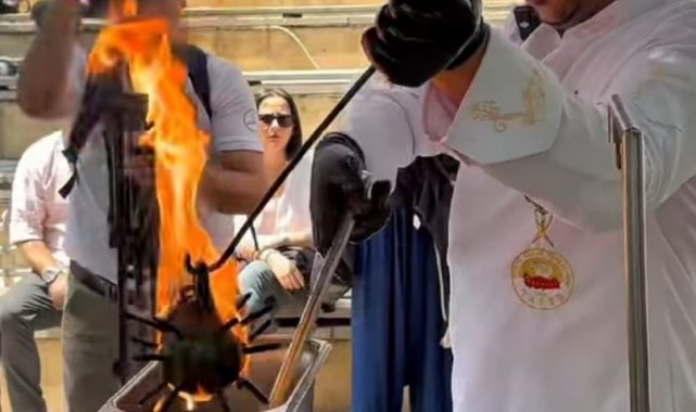 Restoranlarına gelen müşterilerinin bir savaş aletinin kebap sunumunda kullanıldığını görünce şaşırdıklarını belirten kebap ustası Yusuf Kavalcı, "Savaş istemiyoruz, barış istiyoruz. O yüzden savaş aletini kebaba dönüştürdük" dedi.