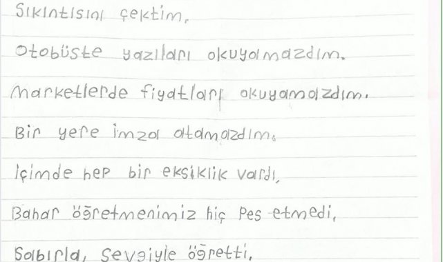 Kocaeli Büyükşehir Belediyesi Meslek ve Sanat Eğitimi Kursları'nda (KO-MEK) okuma yazma eğitimi alan 51 yaşındaki kadının hayatında ilk kez kaleme aldığı mektup duygulandırdı.