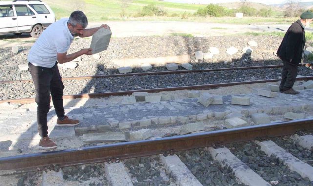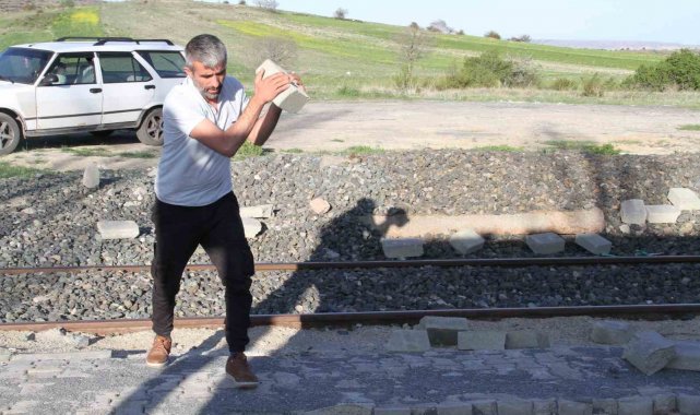 Çankırı'nın Korgun ilçesinde tren yolu kenarındaki yürüyüş yolunun yapımında çalışan ustalar, müteahhitten paralarını alamadıklarını iddia ederek, döşedikleri taşları söküp parçaladılar.