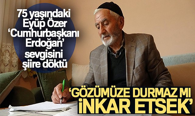 Yozgat'ta yaşayan 75 yaşındaki Eyüp Özer, Cumhurbaşkanı Recep Tayyip Erdoğan'a olan sevgisini şiire döktü. Cumhurbaşkanı Erdoğan'ın ülkeye güzel hizmetler yaptığını belirten Özer, “Gözümüze Durmaz mı İnkar Edersek” adlı şiirini Cumhurbaşkanı Erdoğan'a da okumak istiyor.