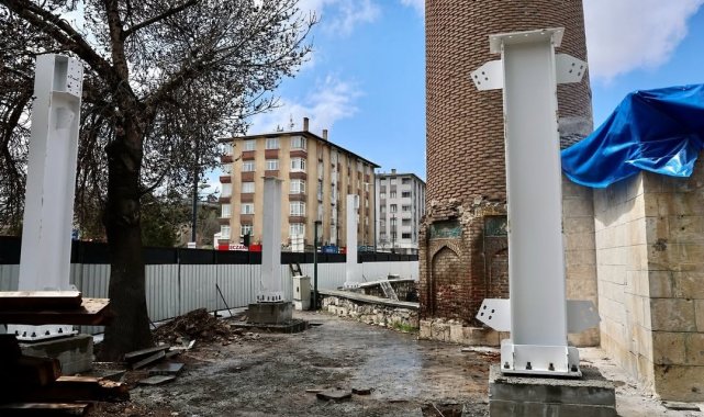 Sivas'ta eğri minaresiyle dikkat çeken 833 yıllık tarihi Ulu Cami'de yürütülen restorasyon çalışmalarında minare iskelesinin nisan sonuna kadar tamamlanması hedefleniyor.