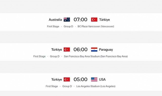 A Milli Futbol Takımı'nın, 2026 FIFA Dünya Kupası D Grubu'nda 20 Haziran Cumartesi günü oynayacağı Paraguay maçının başlangıç saati TSİ 07.00'den, TSİ 06.00'ya alındı.