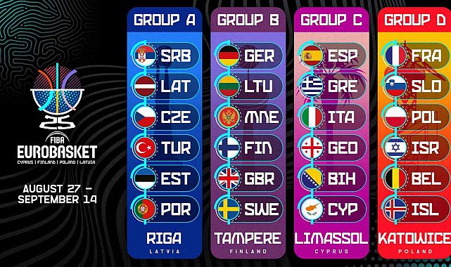 FIBA EuroBasket 2025'te mücadele edecek A Milli Basketbol Takımı'nın maç takvimi açıklandı. Kıbrıs Rum Kesimi, Finlandiya, Letonya ve Polonya'nın ev sahipliğinde 27 Ağustos-14 Eylül tarihleri arasında gerçekleşecek EuroBasket'in final aşaması ise Riga'da yapılacak. A Grubu'nda Portekiz, Estonya, Letonya, Sırbistan ve Çekya ile birlikte yer alan milliler, turnuvadaki ilk maçını 27 Ağustos Çarşamba günü saat 18.00'de Letonya ile oynayacak.