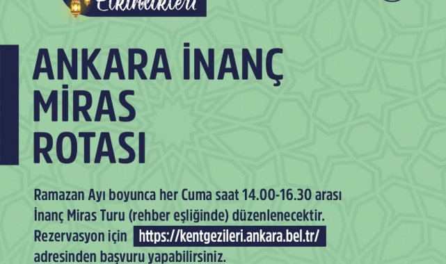 Büyükşehir Belediyesi'nce 'Ankara İnanç Turu-Miras Rotası' da Ramazan'a özel olarak ilk kez hayata geçirilecek. Her hafta cuma günü düzenlenecek olan bu özel gezilerde Başkent'in tarihi ve kültürel mirası keşfedilecek. Rehber eşliğinde gerçekleştirilecek turlarda, 6 cami, 2 türbe ve 1 tapınak ziyaret edilecek. Katılımcılar, kentin farklı inançlara ev sahipliği yapan kadim geçmişini yakından tanıma fırsatı bulurken, Ramazan'ın manevi atmosferini de derinden hissedecek.