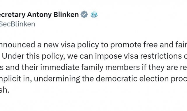ABD, Bangladeş'te özgür, adil ve barışçıl bir seçim dönemi sağlamayı amaçlayan yeni vize politikasını açıkladı. Yeni politikaya göre ABD, Bangladeş'te aralık ayında yapılması planlanan genel seçimler için demokratik süreci engellemekten sorumlu veya buna karışan kişilere veya parti üyelerine vize vermeyeceğini duyurdu. ABD Dışişleri Bakanı Anthony Blinken, dün gece konu ile ilgili sosyal medya hesabından yaptığı paylaşımda, "Bangladeş'teki demokratik seçim sürecini baltalamaktan sorumlu veya suç ortağı olan kişilere ve onların aile üyelerine vize kısıtlamaları uygulayabiliriz" ifadelerini kullandı.