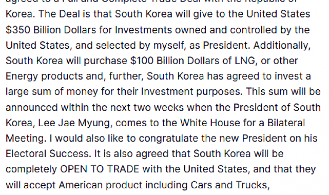 ABD Başkanı Donald Trump'tan, Güney Kore ile yürütülen ticaret müzakereleri ile ilgili kritik bir açıklama geldi. Kendisine ait Truth sosyal medya platformundan paylaşımda bulunan Trump, Güney Kore ile "tam ve kapsamlı" bir ticaret anlaşmasına varıldığını açıkladı. "Anlaşmaya göre, Güney Kore bizzat başkan olarak tarafımdan seçilecek, mülkiyeti ve kontrolü ABD'ye ait yatırımlar için ülkemize 350 milyar dolar sağlayacak" diyen Trump, "Ayrıca, Güney Kore 100 milyar dolar değerinde LNG (sıvılaştırılmış doğal gaz) ve diğer enerji ürünlerini satın alacak" ifadelerini kullandı.