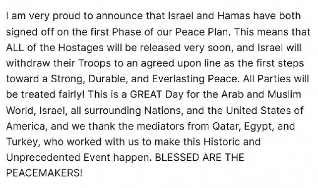 ABD Başkanı Donald Trump, Gazze Şeridi'nde kalıcı barış sağlanmasını öngören Gazze Planı'nın ilk aşamasının "İsrail ve Hamas tarafından onaylandığını" duyurarak, "Bu tarihi ve eşi benzeri görülmemiş olayın gerçekleşmesi için bizimle birlikte çalışan Katar, Mısır ve Türkiye'den arabuluculara teşekkür ederiz" açıklamasında bulundu.