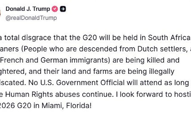 ABD Başkanı Donald Trump, bu yılki G20 Zirvesi'nin Güney Afrika'da yapılacak olmasını "tam bir rezalet" olarak niteleyerek, "İnsan hakları ihlalleri devam ettiği sürece hiçbir ABD hükümet yetkilisi toplantıya katılmayacak" açıklamasında bulundu.