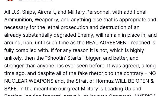 ABD Başkanı Donald Trump, Truth sosyal medya platformu üzerinden İran'la varılan ateşkes anlaşması hakkında açıklamalarda bulundu. ABD güçlerinin varılan anlaşmanın hükümleri tam olarak uygulanana kadar bölgede kalacağının altını çizen Trump, "Zaten büyük ölçüde zayıflatılan düşmanın ölümcül bir şekilde imha edilmesi için gerekli olan ek mühimmat, silah ve malzemelerle donatılan tüm ABD gemileri, uçakları ve askeri personeli, varılan gerçek anlaşmanın hükümleri tam olarak yerine getirilene kadar İran ve çevresinde kalacak" dedi.