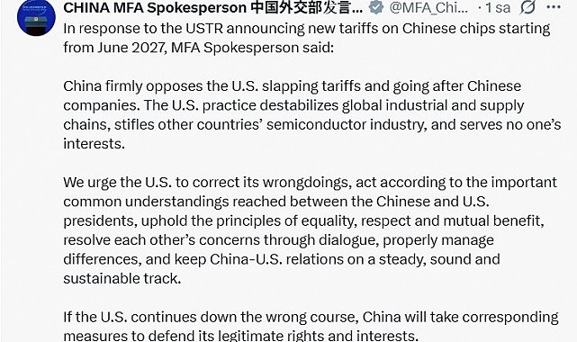 ABD Ticaret Temsilciliği (USTR), Çin'den ithal edilecek yarı iletkenlere 23 Haziran 2027'den itibaren gümrük vergisi uygulanacağı bildirirken, Çin Dışişleri Bakanlığı ise ABD'yi bu karardan dönmeye çağırarak, "ABD yanlış yolda ilerlemeye devam ederse, Çin meşru hak ve çıkarlarını savunmak için gerekli önlemleri alacaktır" açıklamasında bulundu.