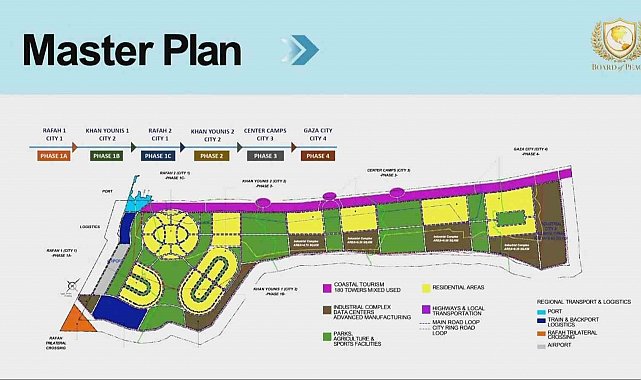 Kushner, yeniden inşa çalışmalarına yönelik ilk planlarından bahsederken, "Başlangıçta, özgür bir bölge ve ardından bir de Hamas bölgesi kurmayı düşünüyorduk. Sonra da, 'hadi yıkıcı bir başarıya hazırlık yapalım' dedik" ifadelerini kullandı. Dinleyicilere "Yeni Gazze" olarak adlandırdığı "ana planını" gösteren bir slayt gösterisi sunan Kushner, söz konusu plan kapsamında, konut geliştirme, veri merkezleri ve sanayi parkları için ayrılmış alanları gösteren renk kodlu bir haritayı detaylandırdı. Haritada Gazze Şeridi'nin yerleşim, kıyı turizmi ve karma kullanım bölgelerine ilişkin planlar yer aldı.