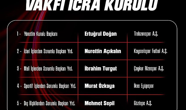 Kulüpler Birliği Vakfı'nın sosyal medya hesabından yapılan paylaşımda, "Kulüpler Birliği Vakfı İcra Kurulu görev dağılımı belli oldu" ifadelerine yer verilirken, İcra Kurulu görev dağılımı da şu şekilde gerçekleşti: