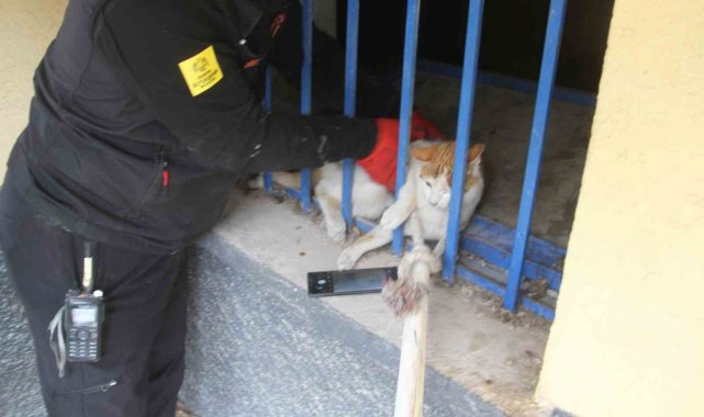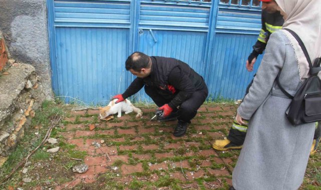 Açlıktan bitkin düşen kedi itfaiye ekiplerince kurtarıldı