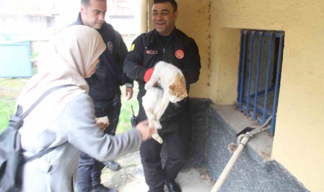 Konya'nın Beyşehir ilçesinde bir binanın bodrum katında mahsur kalan kedi, itfaiye ekiplerinin uzun uğraşları sonucu kurtarılarak hayata tutundu.