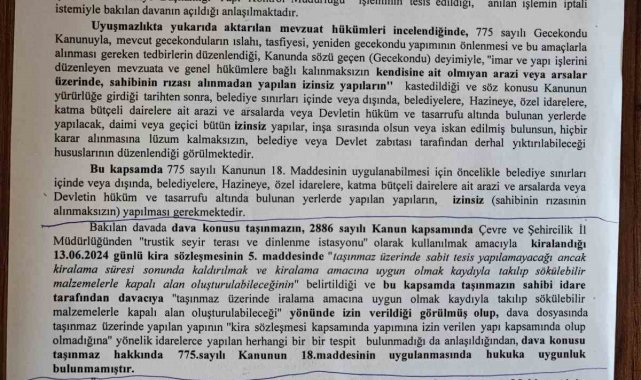 "Burası için imara aykırı diyorlar. Ama ASKİ yani belediye imara aykırı yapıya nasıl su aboneliği verdi. Etrafta benzer bir sürü yapı var. Onlara neden yıkım kararı çıkmıyorda bize çıkıyor. Bunlar hepsi bilinçli yapılan şeyler. Hem Çukurova hem de büyükşehir belediyesi bilinçli olarak bizim 3 yıllığına kiraladığımız tesisimizi yıkmaya çalışıyor. Bizim bu yapı için gerekli olan her yerden iznimiz var. Ben burayı çevre şehircilikten seyir terası yapacağım diye kiraladım. Benim bütün evraklarım var her şey hukuki. Hukuksuzluk yapan büyükşehir ve Çukurova Belediyesidir."