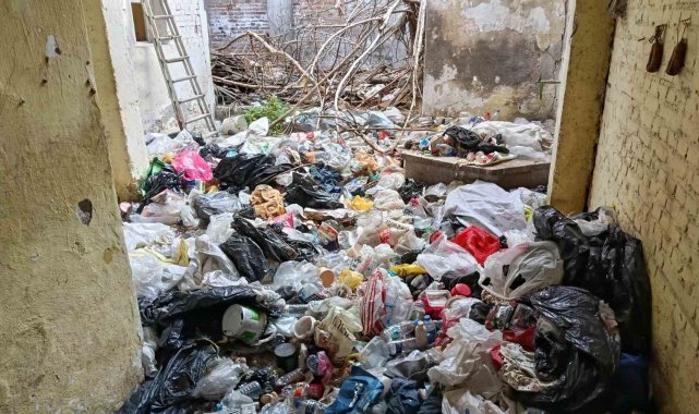 Adana'da kötü koku ihbarı üzerine girilen böceklerin sardığı bir müstakil evden, 2 kamyonet dolusu çöp çıkartıldı.