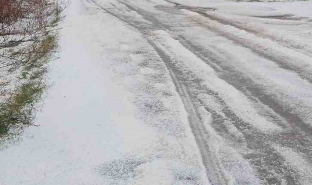 Adana'nın Karataş ilçesinde yağan dolu, yolları ve tarlaları beyaza bürüdü.