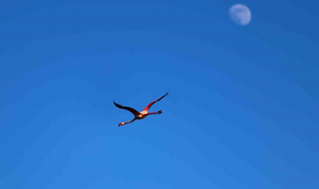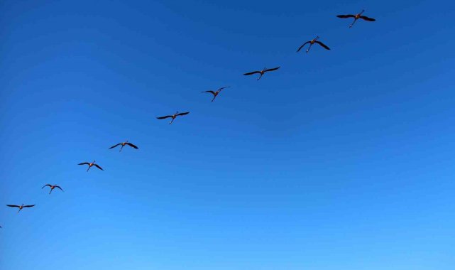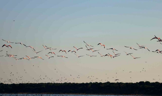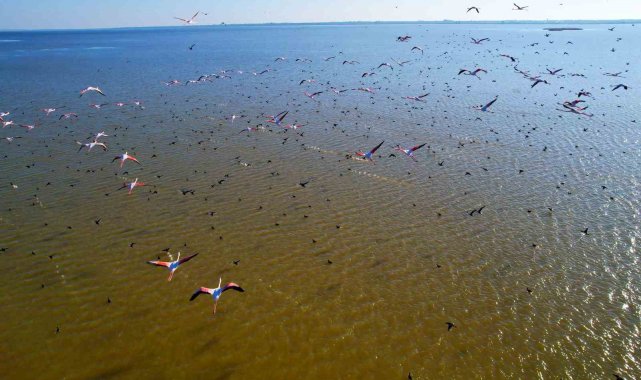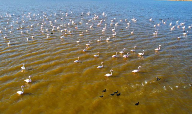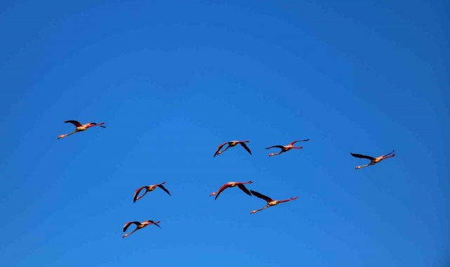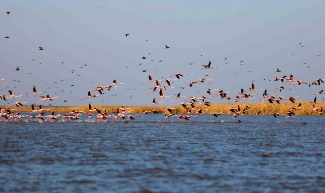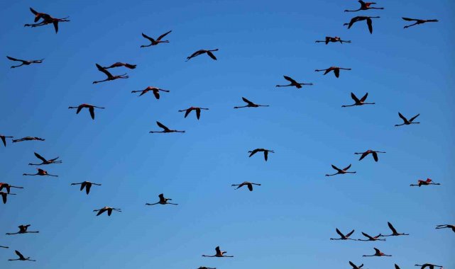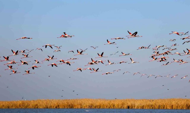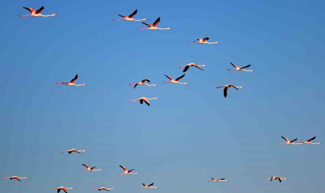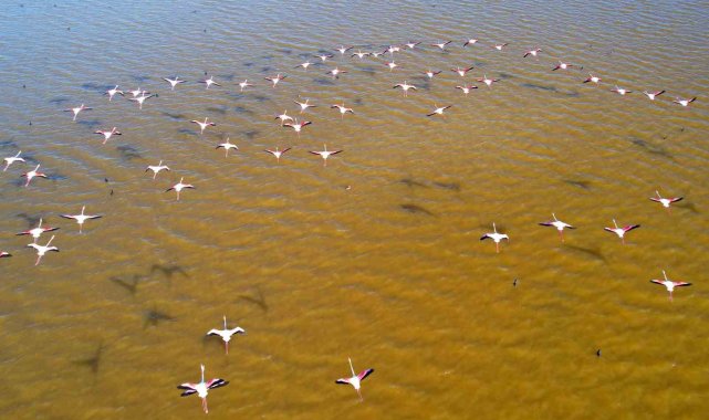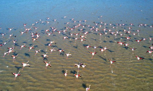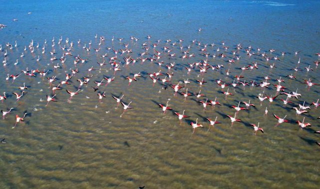 Soğuk kış günlerinde donmuş göllerden kaçan flamingolar, Adana'nın Karataş ilçesindeki Akyatan Lagünü'nde konaklıyor. İnce bacaklı, uzun eğri bir boyuna ve renkli tüylere sahip binlerce flamingo lagünde görsel şölen sunuyor.