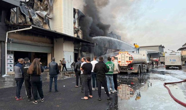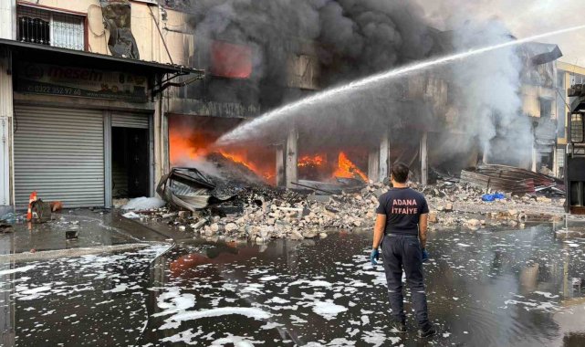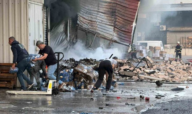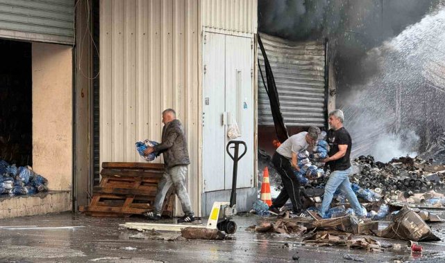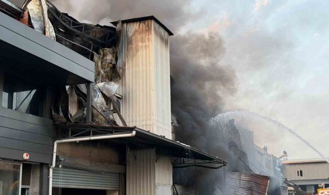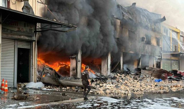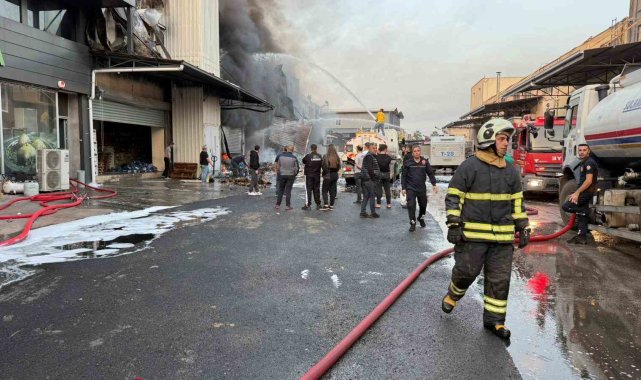 Bitişik iş yerlerine de sıçrayan yangında soğutma çalışmaları sürüyor.