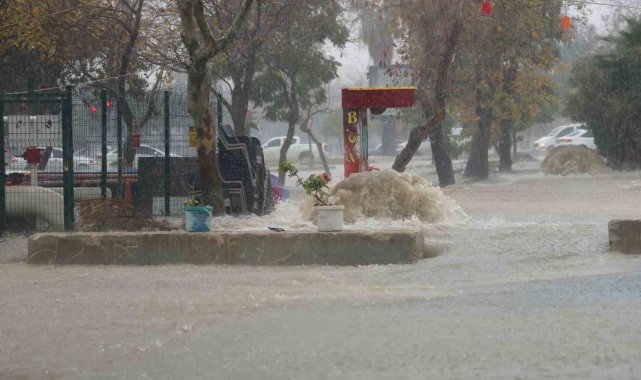 Adana'da şiddetli sağanak yağış yolları göle çevirdi, bazı apartmanların bahçeleri suyla doldu, kentteki rögarlar ise volkan gibi patladı.