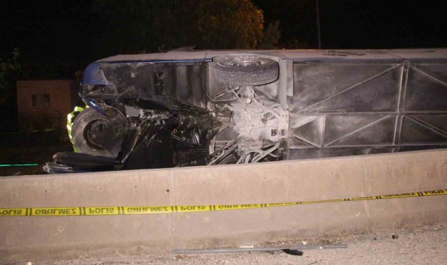 Adana'da otoyolda beton bariyere çarpan yolcu otobüsü devrildi. Meydana gelen kazada 8 kişi yaralandı.