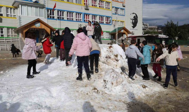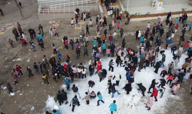 Torosların eteklerinden kamyonlarla getirilen kar Adana'nın Kozan ilçesinde bir okulun bahçesine döküldü, öğrenciler unutulmaz anlar yaşadı.