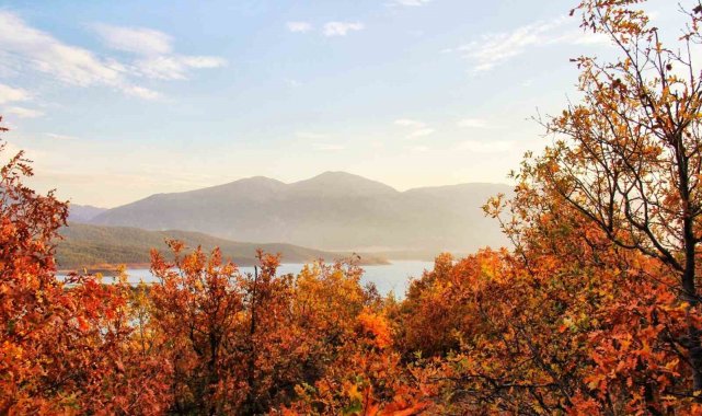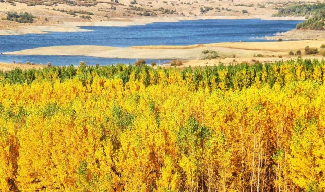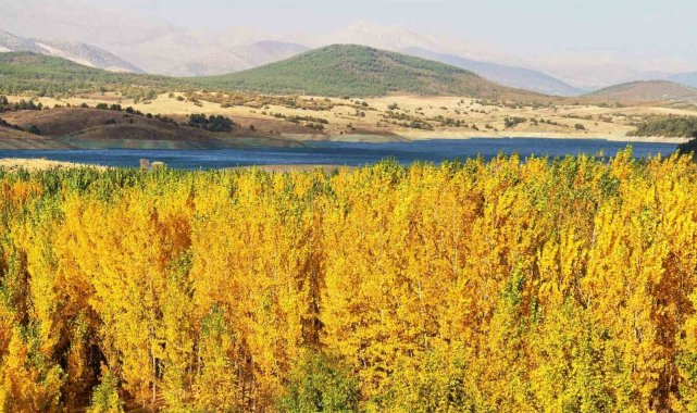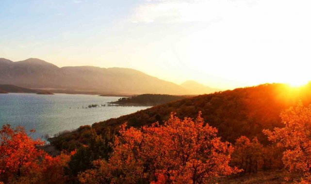 Kahramanmaraş'ın Göksun ilçeasinde Adatepe Barajı etrafı sonbahar ile birlikte renk cümbüşüne dönüştü.