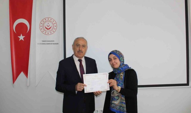 Eğitim sürecini tamamlayan kursiyerlere katılım sertifikaları, Aile ve Sosyal Hizmetler İl Müdürü Salih Köse ile kurum yöneticileri tarafından takdim edildi.