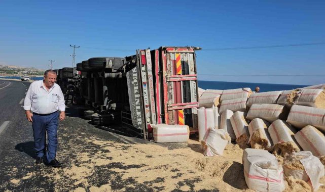 Adilcevaz'da saman yüklü tır devrildi: 2 kişi yaralandı