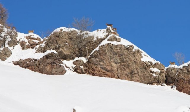 Koçali Köyü yakınlarında ve rakımı yüksek dağlık bölgelerde yaşayan yaban keçileri, yağan kar ile birlikte yiyecek bulmakta zorluk çekiyor. Yiyecek bulmak için sürüler halinde kar üzerinde ilerleyen yaban keçileri, drone ile havadan görüntülendi. Onlarca yaban keçisinin, 1 metreyi geçen kar kalınlığının olduğu yerlerden kayalık bölgelere giderek yiyecek aradığı görüldü.